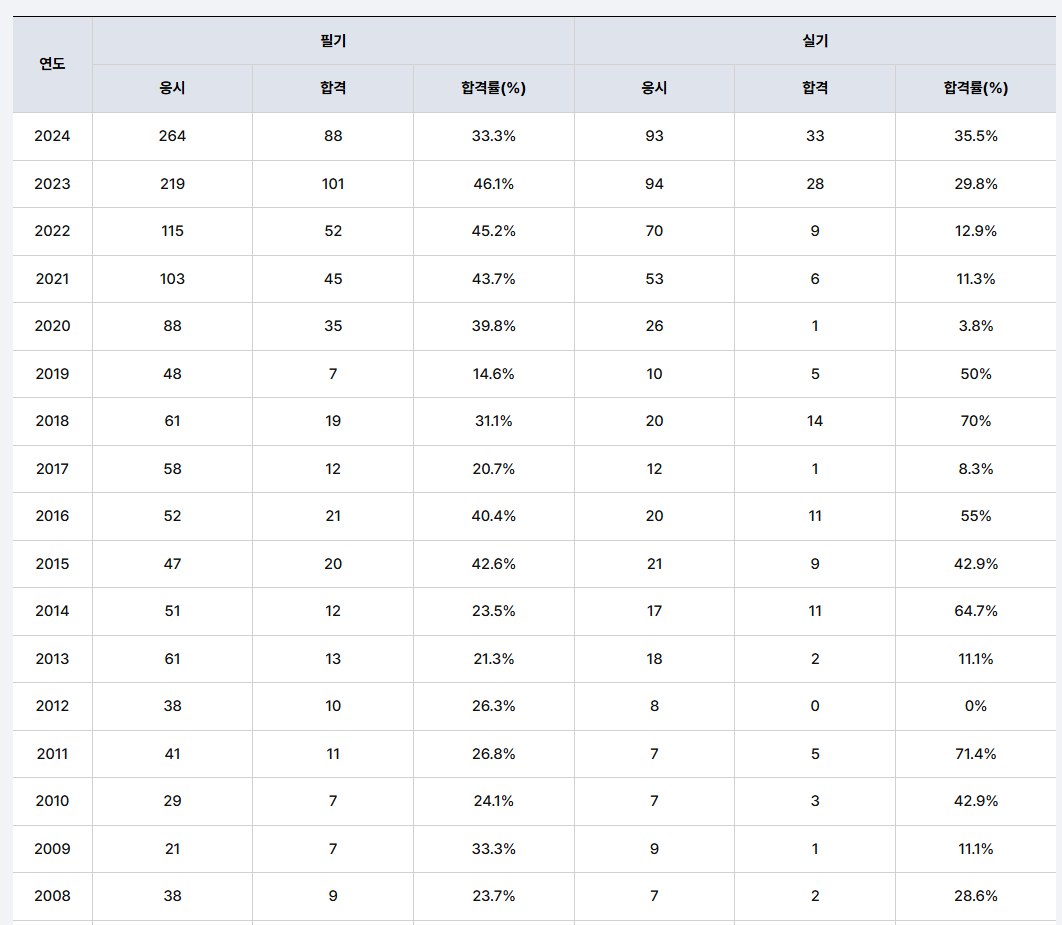 시설원예기사의 합격률은 다른 기사 자격증에 비해 상대적으로 낮은 편입니다. 특히, 회차 및 연도별로 난이도 차이가 크게 나 최종 합격률이 10% 미만으로 떨어진 경우도 있습니다.