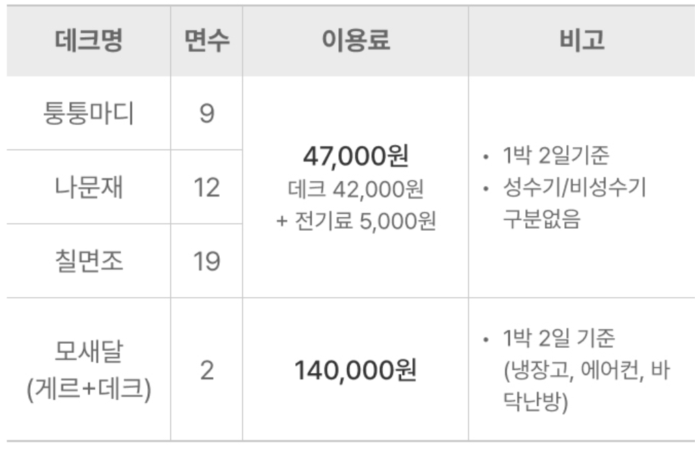 - 캠핑장 규모: 데크 총 42면 (퉁퉁마디 9면, 나문재 12면, 칠면초 19면, 모새달(게르+데크) 2면)