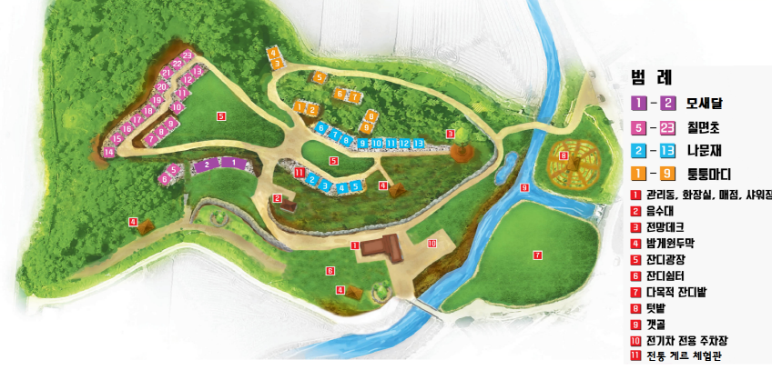 - 캠핑장 시설: 데크, 게르, 샤워실, 매점, 전기차 셔틀, 음수대, 잔디광장, 전망데크 등