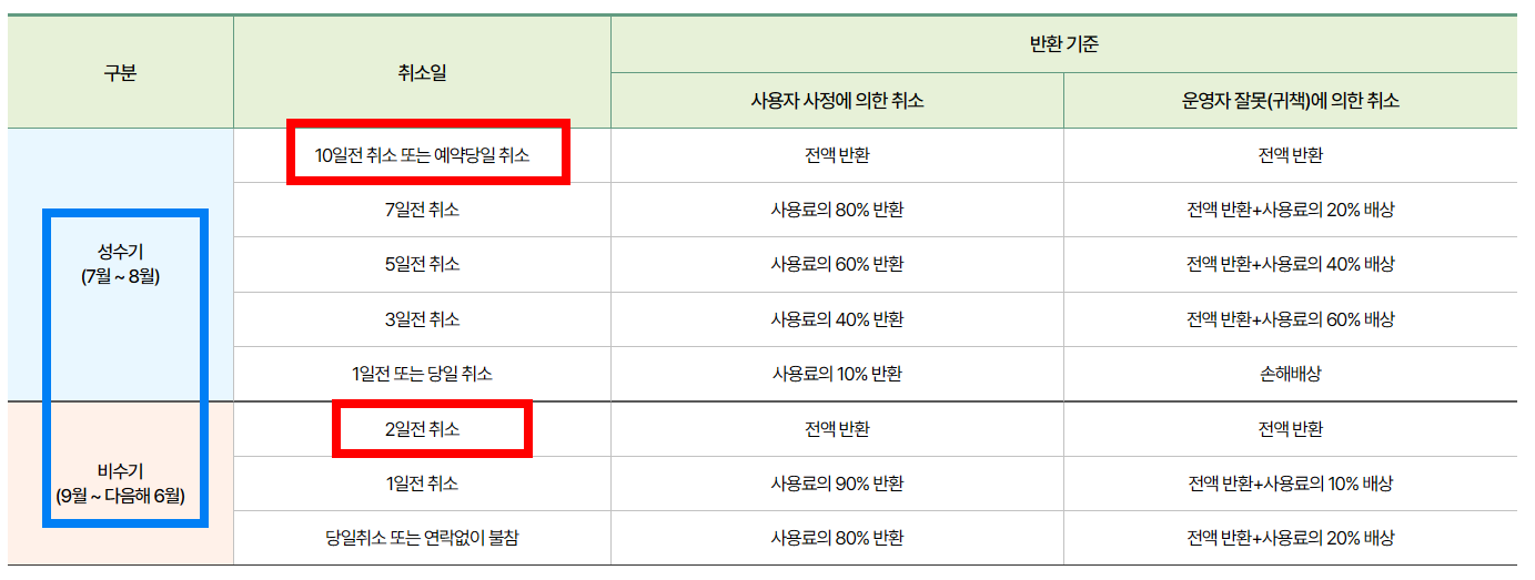 성수기는 7~8월로 규정하고 있으며 10일 전까지 전액 반환됩니다.