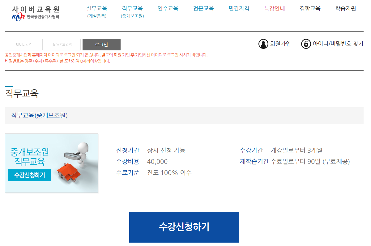 - 신청방법: 한국공인중개사협회 사이버연수원에서 온라인으로 신청 가능합니다.