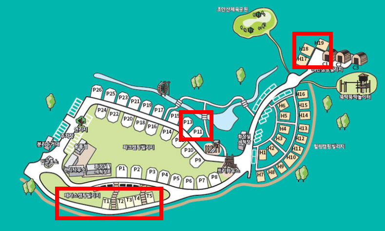 프라이벗한 테라스캠핑빌리지가 예약인기가 높습니다 H사이트는 짐을 일일이 옮겨야 하는 번거로움이 있습니다 아이가 있는 가족단위는 파크캠핑빌리지 9~13번을 추천드립니다