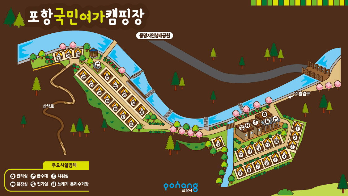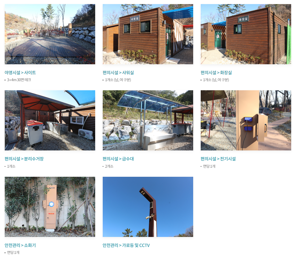 - 캠핑장 시설: 관리사무소, 샤워장, 음수대, 주차장, 수레 대여, CCTV, 소화기, 재난 예경보 시스템
