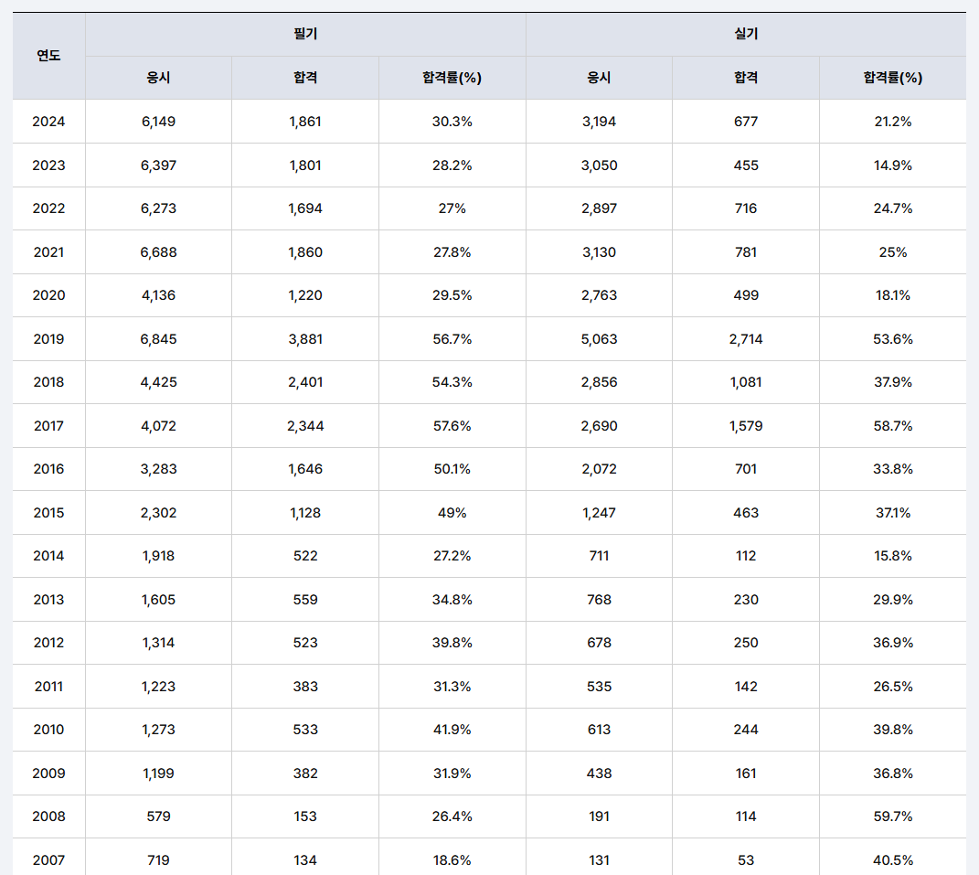 최근 필기시험 합격률은 약 30%, 실기시험 합격률은 약 20~50%로 난이도가 높습니다